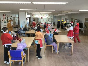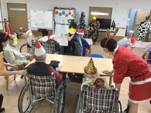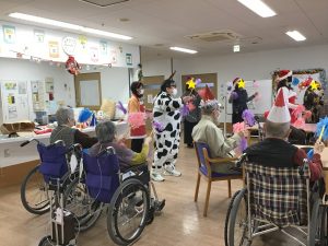 12月20日(土)にクリスマス会を開催しました。今年最後の行事なので、職員も全力で楽しみま~す🥳クリスマスなのになぜか??🐄がいますよー笑